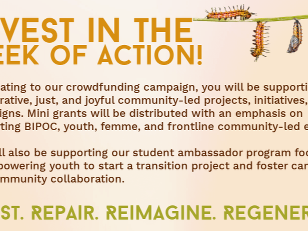 Our crowdfunding campaign for the Week of Action aims to raise $10,000. By donating to our crowdfunding campaign, you will be supporting regenerative, just, and joyful community-led projects, initiatives, and campaigns. Mini-grants will be distributed during the week of action with an emphasis on supporting BIPOC, youth, femme, and frontline community-led efforts.