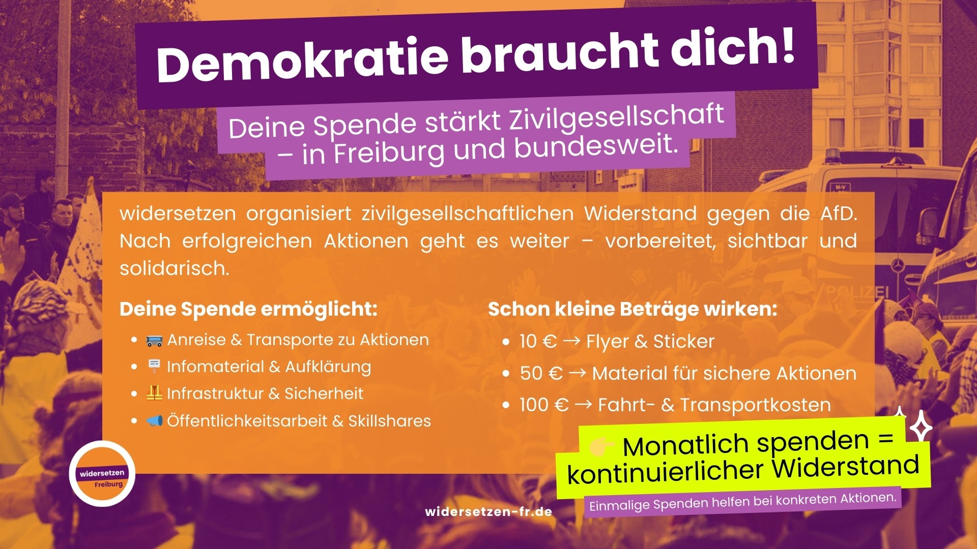 Diese Aktionen sind nur möglich, wenn wir die nötige Infrastruktur und Mobilisierung im Vorfeld finanzieren können.