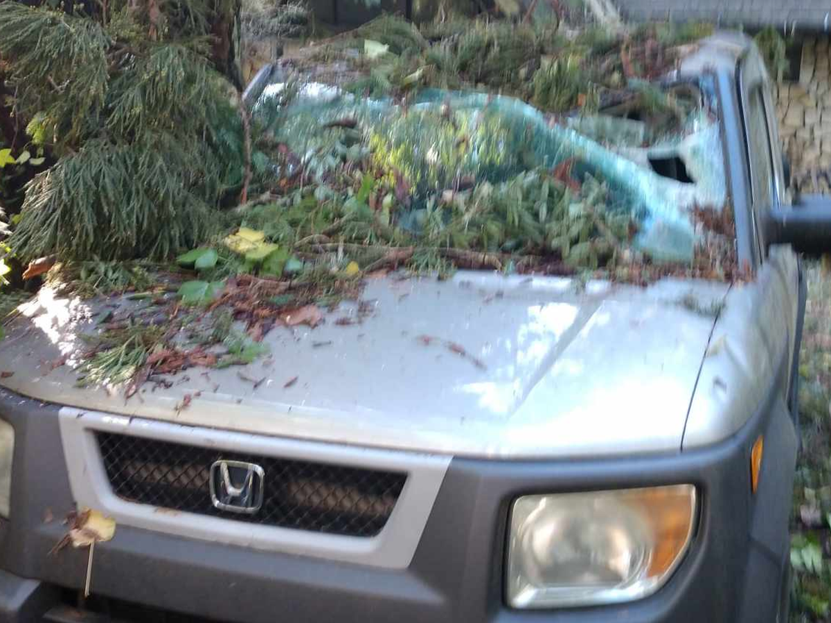 One tree crushed James's car and another tree took out most of his home , Dining Room, Second Floor, Deck, Kitchen, , bedroom and Living Room leaving James homeless and with out a car.