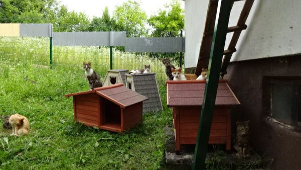 Zu unserem Haus gehört ein Grundstück von knapp 4.000 m². Hinter dem Haus haben wir bereits das alte Außengehege aufgestellt in das die Kätzchen vom Dachboden über eine Treppe gelangen können. Im Garten stehen die Elemente eines gespendeten Außengeheges, um den restlichen Innenhof katzensicher einzuzäunen. Doch leider fehlte bis dato das Geld es zu installieren. Das Gehege müsste zuerst aufgestellt werden, damit die Kätzchen vom Dachboden alle in den Garten können und die Arbeiten am Dach ausgeführt werden können. Die Kosten inklusive Isolierung, Verkleidung, Elektrik und Fußboden betragen geschätzt 20.000,- Euro einschließlich der Montage des Außengeheges.