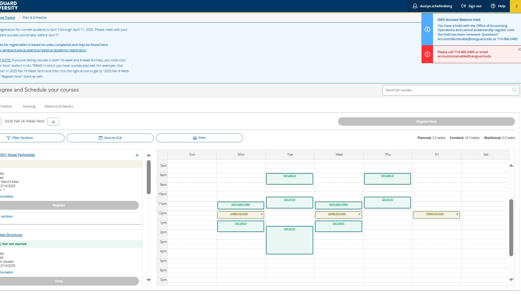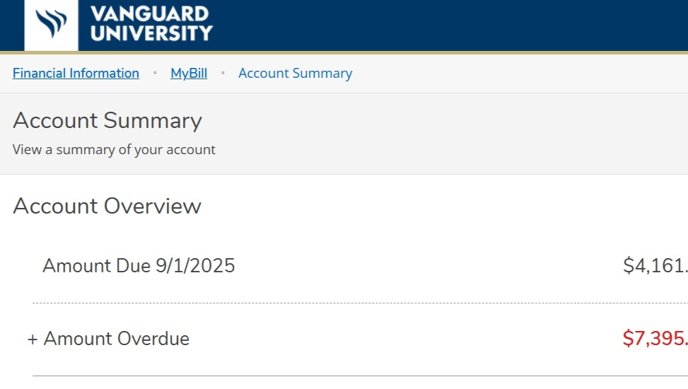 This fall semester I will be entering my Junior year. However, upon registering and planning my schedule, I was not able to add and register for my last planned class for the semester. This was all due to a charge on my account of exactly $7,395.00 that was suddenly added with no notice, letter, or email as to why. This is also an overdue amount on top of my required monthly payments for this semester. In turn, I reached out to the Vanguard Office of Accounting, who explained to me that FAFSA had determined that I no longer qualified for the Pell Grant (a need-based grant for those in financial struggle that need an extra boost in funds to pay for school needs), despite the fact that my Mom cannot work as she prioritizes my care and looking after me and my medical necessities, as well as my Dad being in and out of work as there have been struggles in the Motion Picture Industry and was therefore most definitely in financial need. I was then further told that I would be fine attending this fall semester but would not be able to add that last class as I previously mentioned, nor would I be able to register for the Fall Semester until this balance is paid off and must be paid by the end of November of this year.