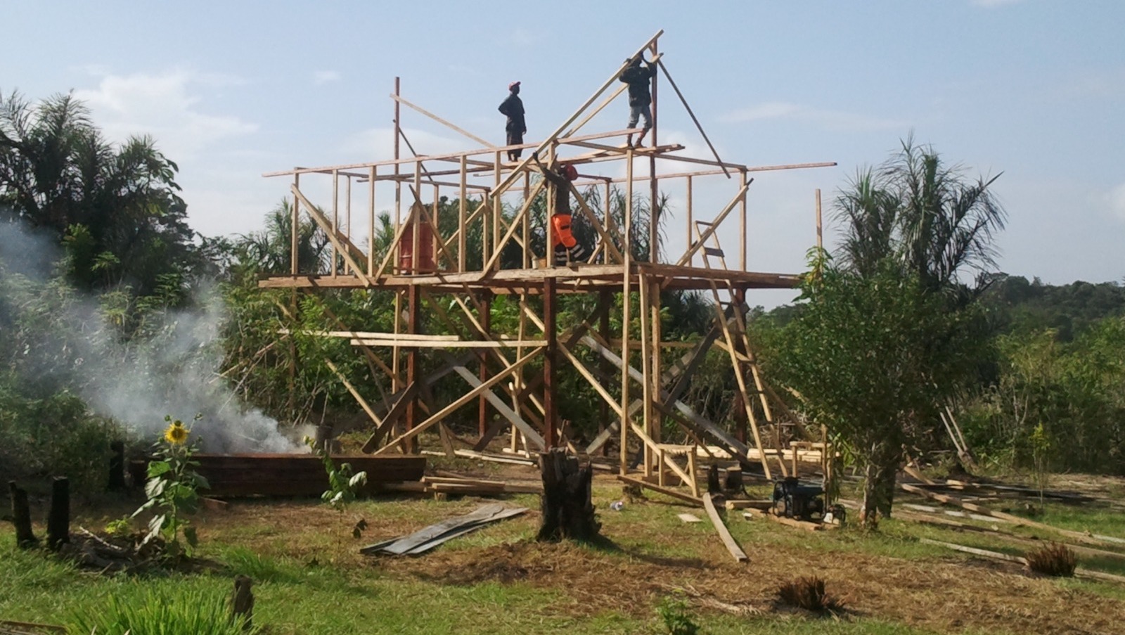 - Het gebouwtje, Ananiswosu, in aanleg dat achter het Samaaka (Marron) museum in het dorp staat afmaken. Zie onder foto van het geraamte dat er al staat.