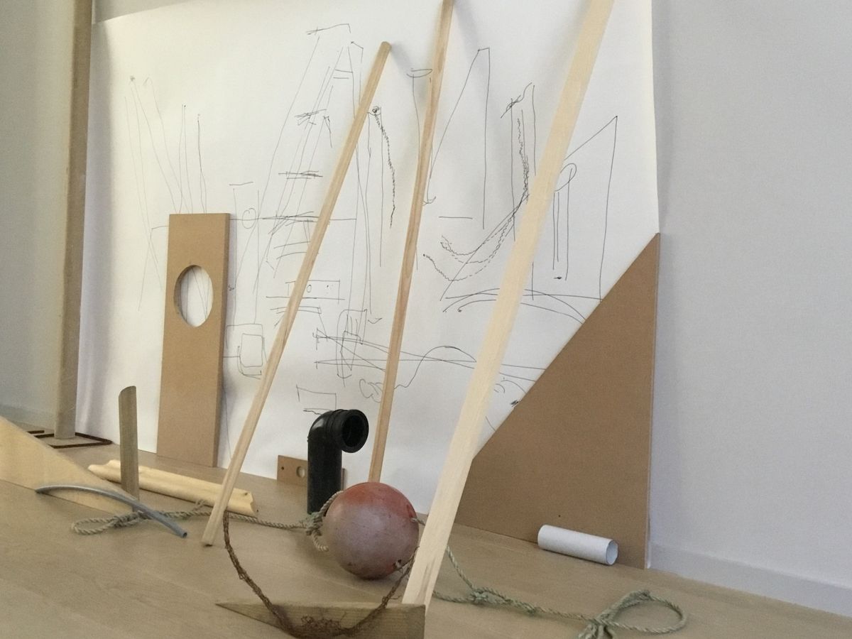 'onaway', installation with found material translated into drawing translated back into installation