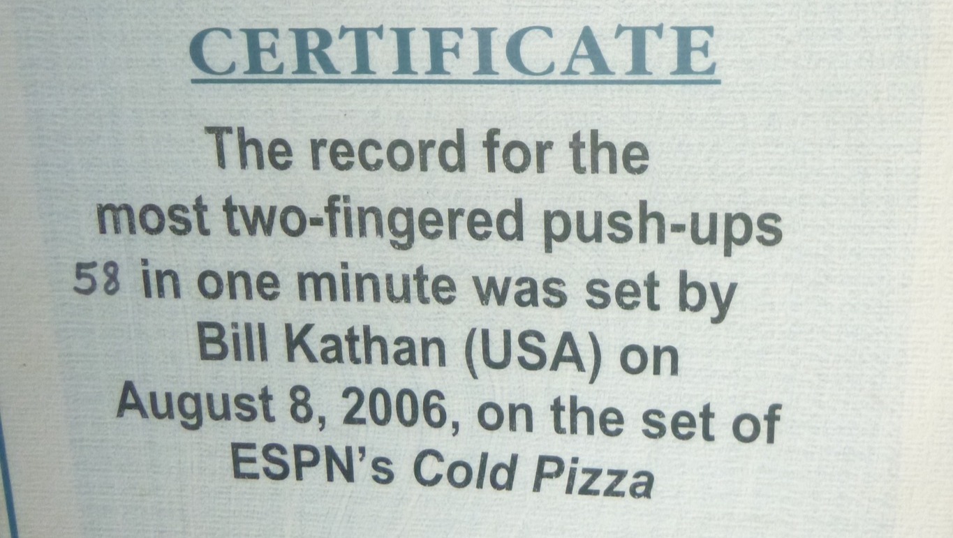 Kathan's claims to world record status are mostly based on listings he has found on the Internet. He has applied to have his athletic feats listed in the Guinness Book of World Records, though the book does not yet acknowledge most of the categories in which he competes.