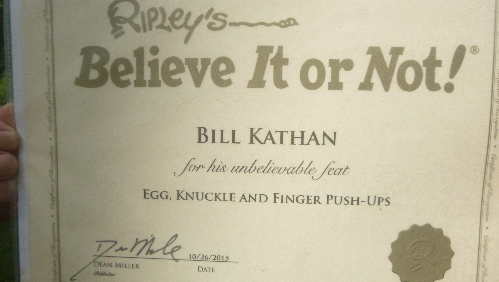 ➡️WATCH VIDEO: Real Bill Does Push-Ups on Raw Egg / Nov. 6, 2015 / Bill Kathan showed up unexpectedly at Ripley’s headquarters in Orlando, FL and though we normally prefer appointments, he piqued our interest when he said he could do push-ups while balancing on raw eggs.