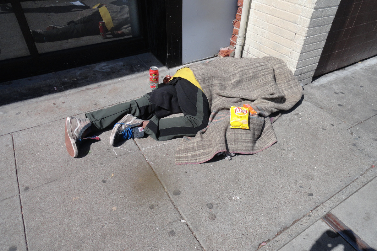 "The Little Way" Homeless Outreach hands out a bag of potato chips and a package of peanut butter and cheese crackers to homeless people on the streets in Berkeley California. We also hand out socks to those who need them.