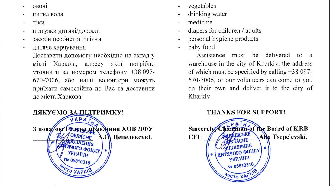 I am attaching an official document from the charity we have partnered with requesting the supplies. More information will be posted on our social media platforms. Please reach out with any questions/concerns. Let's all help Ukrainian children, mothers, and fathers live a life in peace and prosper! Let's all Stand With Ukraine!