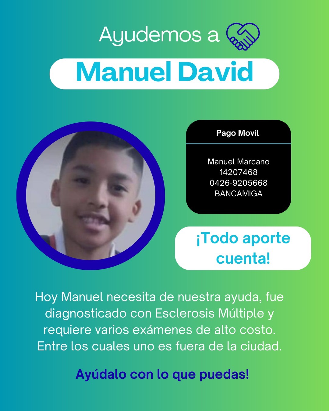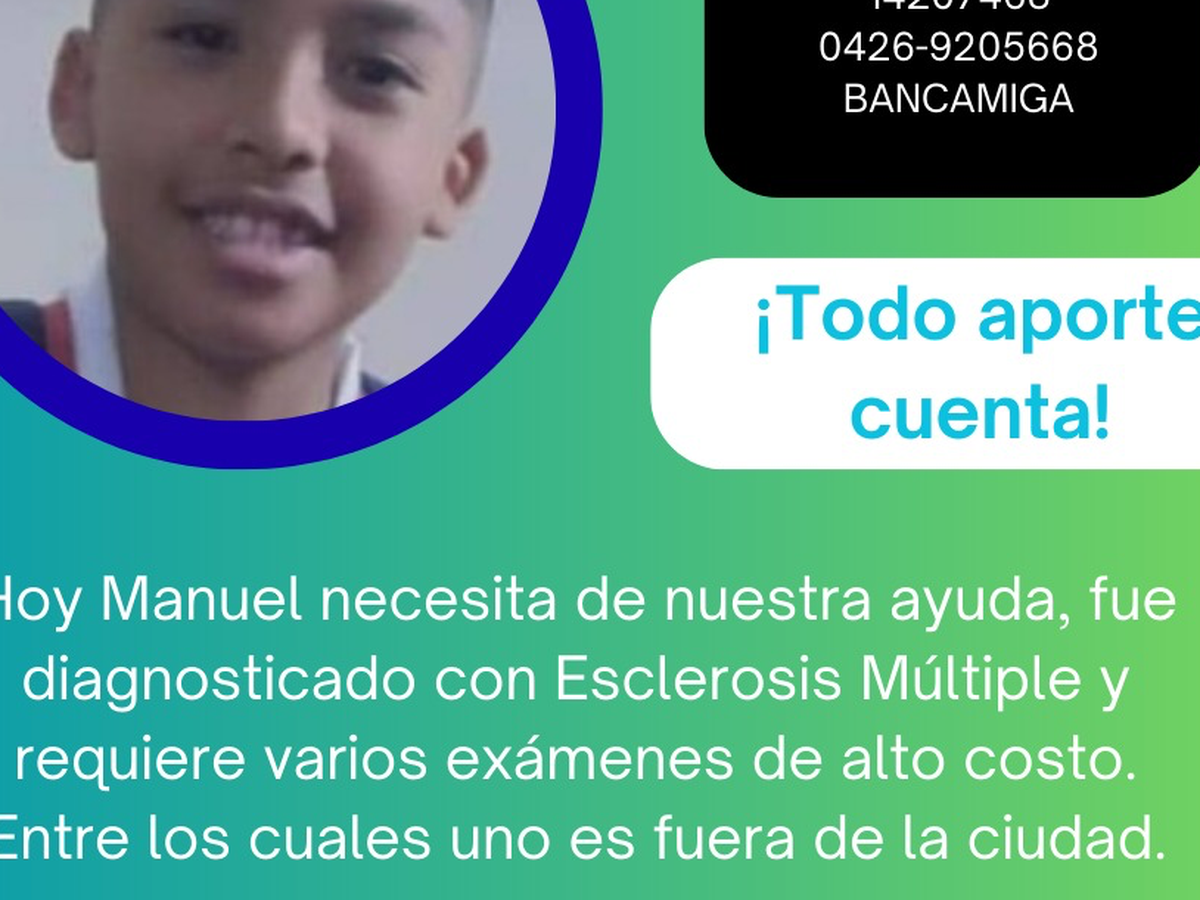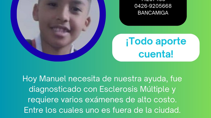 Hola, me llamo Gustavo Acevedo. Estoy recaudando fondos para mi Primo Manuel David Marcano está sufriendo de esclerosis múltiple. No le permite caminar como un niño normal. Ahorita necesita muchos estudios y medicamentos con los cuales sus padres no cuentan en este momento y es una enfermedad en la cual debe ser tratada con tiempo, ya que es una enfermedad bastante agresiva y necesitamos de tu ayuda para que Manuel David siga siendo el niño normal y pueda recibir su tratamiento médico. Esperemos y puedan ayudarnos y que Dios le multiplique todo esa ayuda que nos puedan dar.