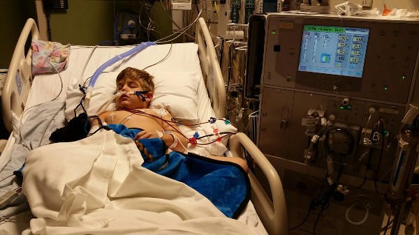 On 11/13/15 our son Xander started having flu like symptoms. After a day and a half very bad bloody diarrhea. We took him to the ER on Sunday and he tested positive for e-coli. He was admitted to the hospital at that point. They tried four times to put an IV in before they were successful. Xander was in the hospital for almost a week. It seemed that he was slowly getting better.