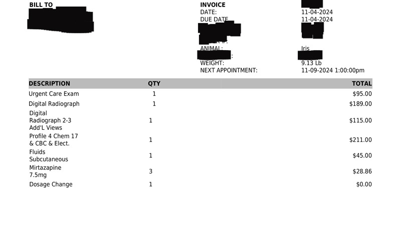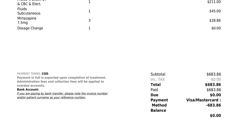 Initial visit and diagnostic tests: $700 (invoice below in 2 parts)