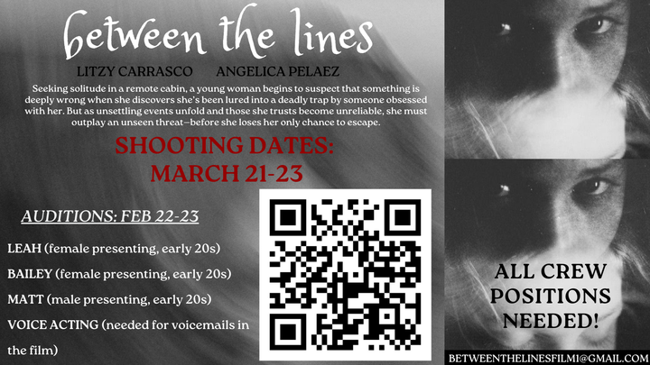 Hi everyone! Our names are Angelica Pelaez and Litzy Carrasco and we are BA Film students at the University of Arizona! This semester, we teamed up in our Fiction Production class to create a Psychological Thriller short film, which we've named 'Between the Lines' which will center the following: