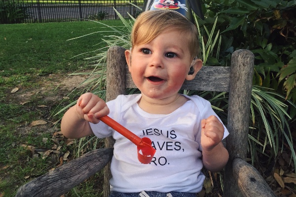Caden just turned a year old on March 26, 2016. He was born with bilateral sensorineural hearing loss and is deaf in both ears. We recently found out the cause of his hearing loss. While I was pregnant with my sweet boy I caught the cytomegalovirus (CMV), which I would've shown no symptoms. This particular virus is very dangerous for the baby in utero as it can travel to the baby and cause many problems. Caden was born with congenital CMV, which has caused developmental delays, cerebral palsy, microcephaly, hearing loss, and he is more likely to have seizures due to calcifications around his brain. We have started our journey with sign language, hearing aids, speech therapy, cochlear implants, occupational therapy, and physical therapy. Due to Caden's cerebral palsy it's difficult for him to move his arms in a way that other kids his age do. He hasn't quite started crawling or walking yet, but he's almost got the hang of sitting up all on his own! His therapists have been making great progress with him! Caden loves being outside, loves his big brother, and he absolutely adores dogs!! He is most vocal and active when he gets to play with dogs and puppies! He gets so excited and starts trying to reach for and pat the dogs, and cooing and making lots of noise. Any noise he makes is great for his vocal chords! Having a therapy dog for Caden will help him improve his motor skills, motivate him to speak and make sounds, and improve his mood after many therapy sessions.
