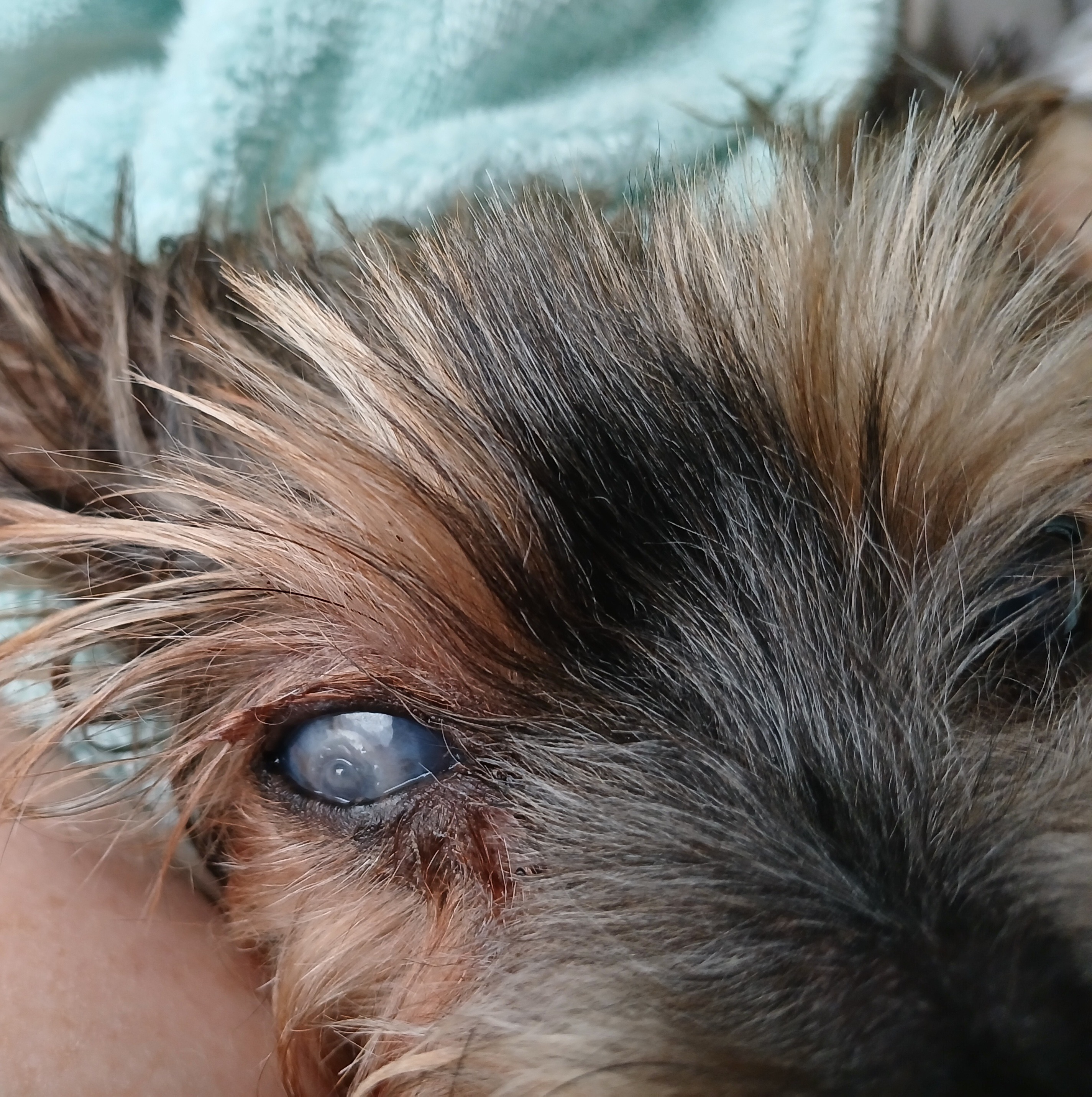 He has an ulcer in his left eye that we are treating with eye drops and pain medication, hoping for it to heal.