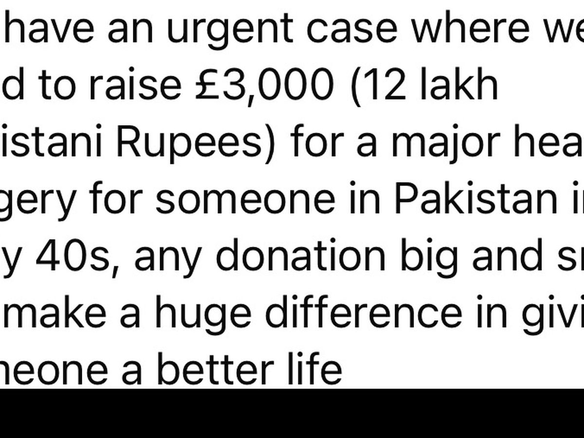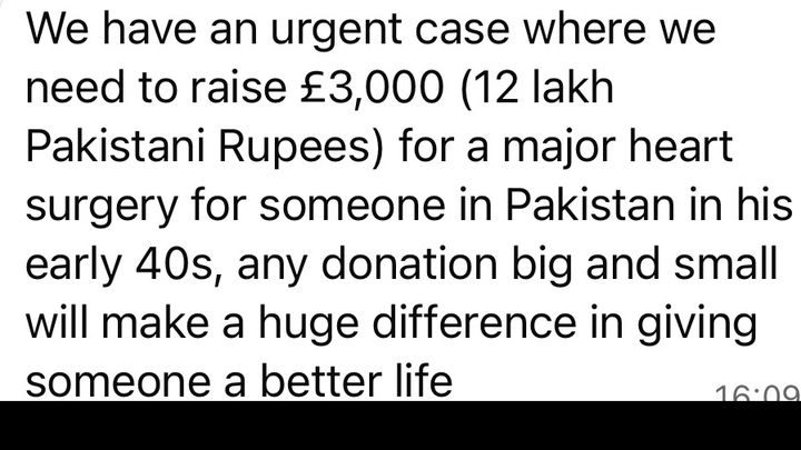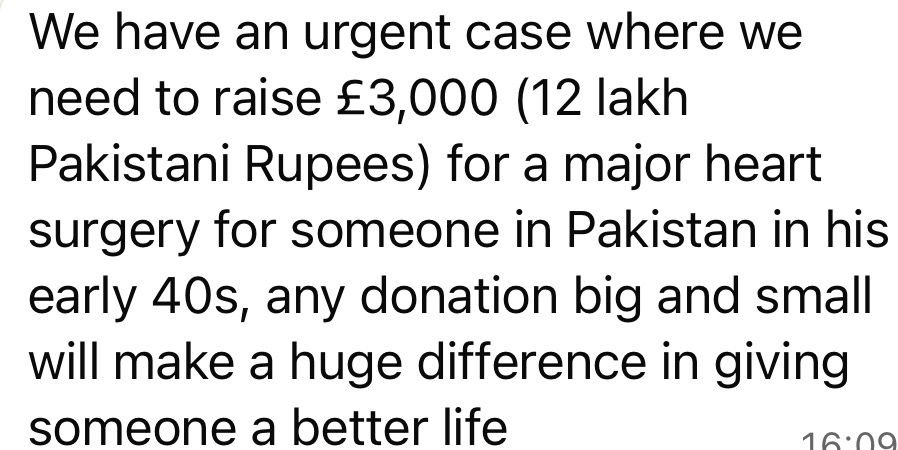 Salam We have an urgent case where we need to raise £3,000 (12 lakh Pakistani Rupees) for a major heart surgery for someone in Pakistan in his early 40s, any donation big and small will make a huge difference in giving someone a better life