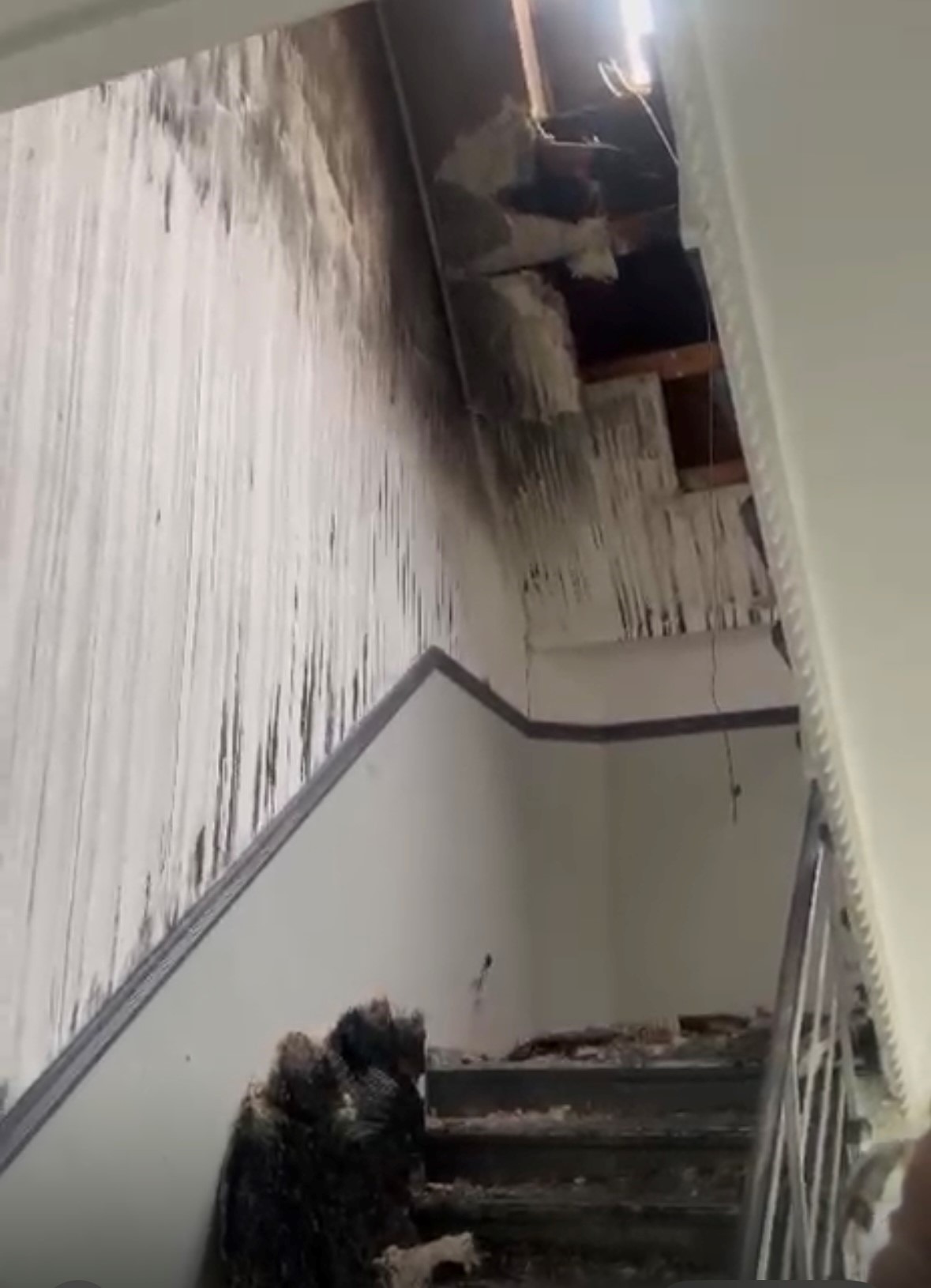 Das Gebäude ist stark einsturzgefährdet, die Wohnung stand durch die Löscharbeiten gänzlich unter Wasser, Teile der Decke sind runtergefallen, die Nachbarswohnung hat gar keinen Dachstuhl mehr drüber und ihr blieb kurz und knapp -Nichts-.