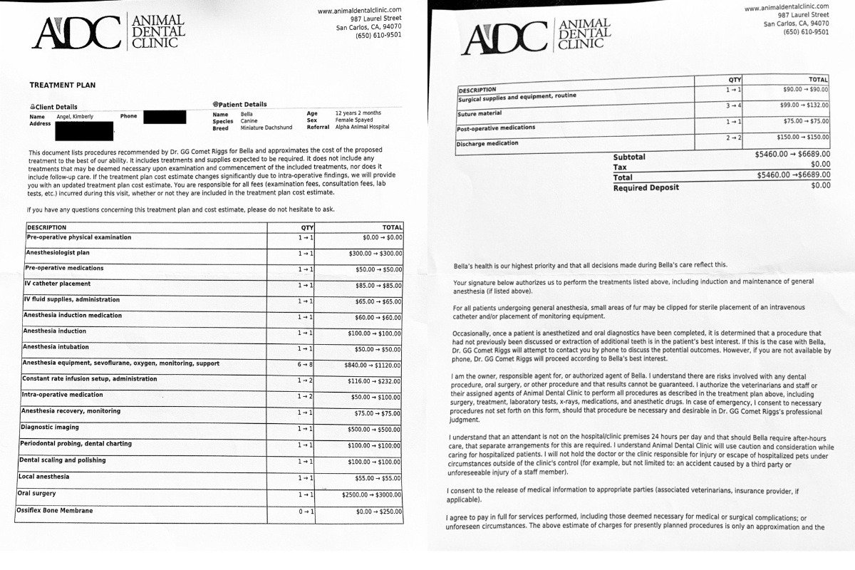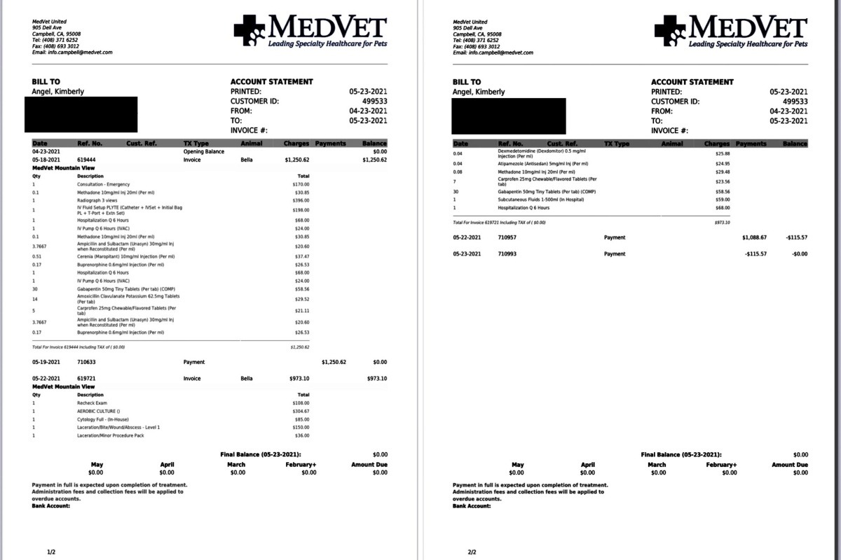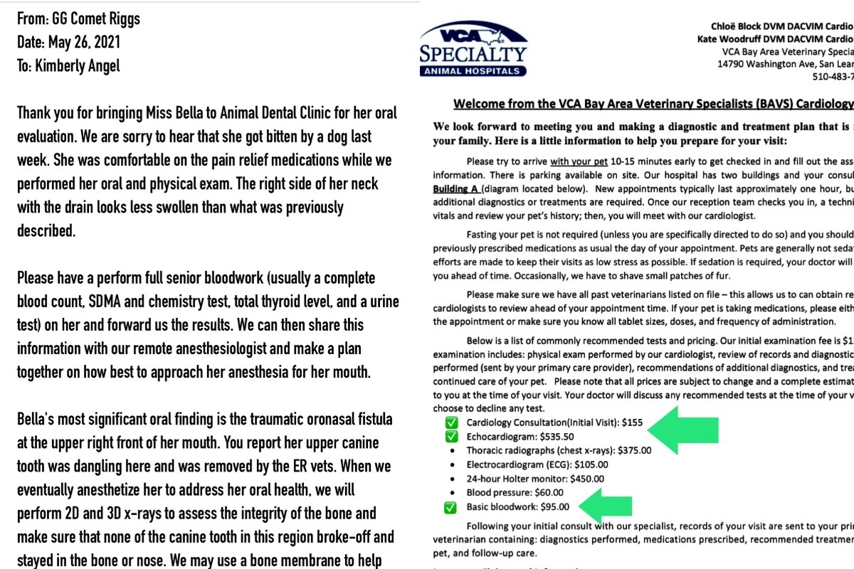 I have included pictures of her after she got home from emergency as well as the main medical bills thus far and the estimate for her oral surgery.