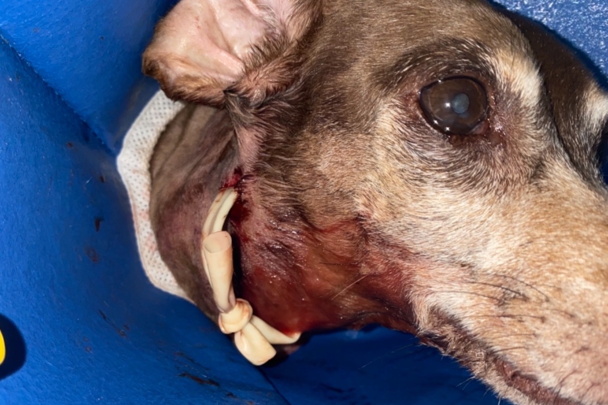 The vet said she was lucky to be alive! Her lung was bruised (thankfully not punctured), she had air caught subcutaneously around her neck from the dog thrashing her around and her canine tooth was ripped out by the other dog during the attack; leaving a hole in her mouth & jaw bone creating an opening up into to sinus cavity. This explains the blood coming out of her nostrils.