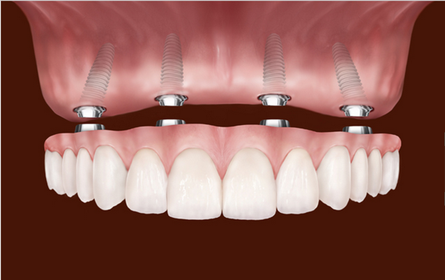 Mum will need a minimum of eight inplants. Four in either jaw. The implants are titanium fixtures that are drilled into the jaw bone. As the jaw bone heals it fuses to the fixture and creates a strong foundation for fake teeth. This is called osseointegration.