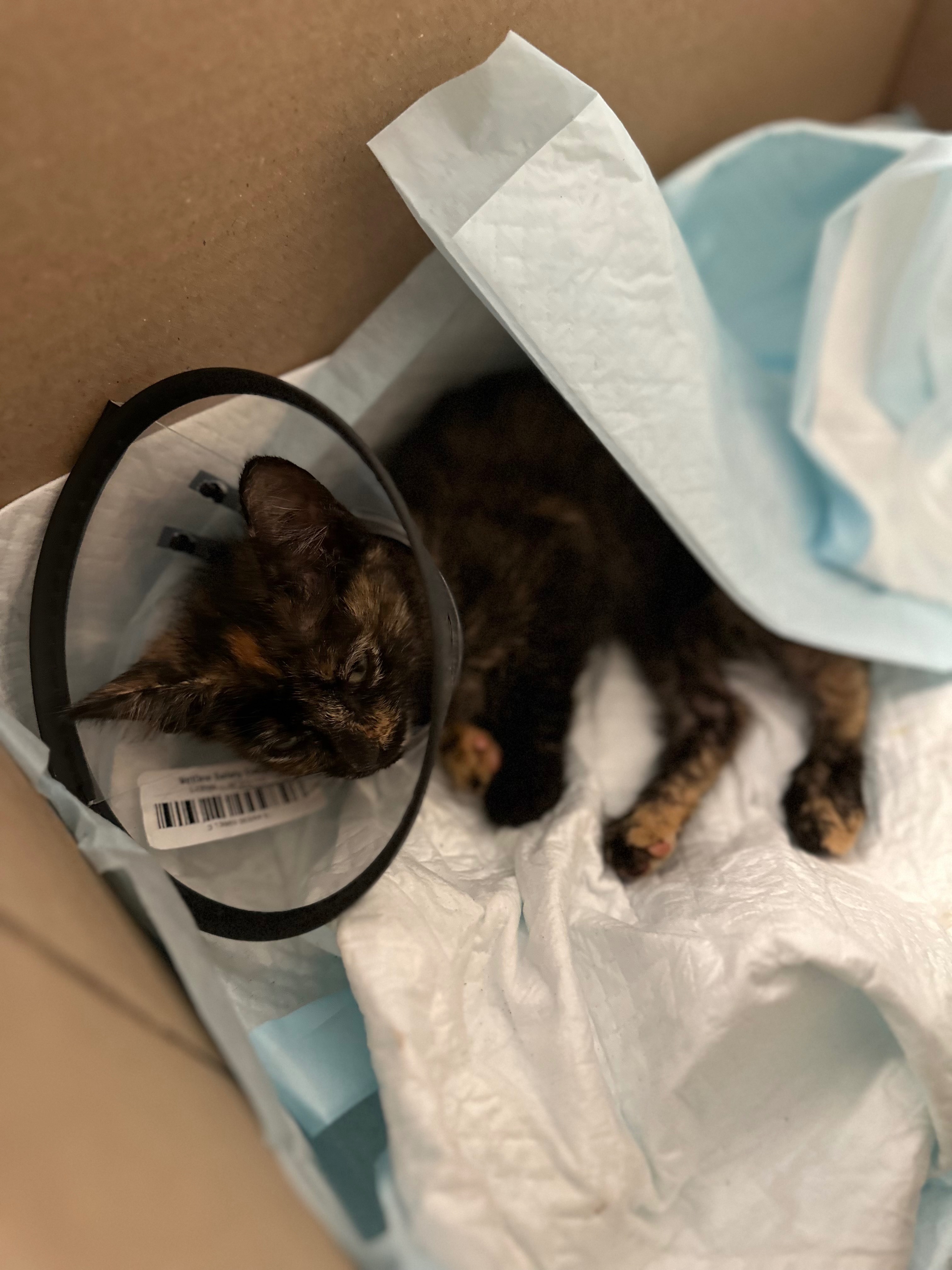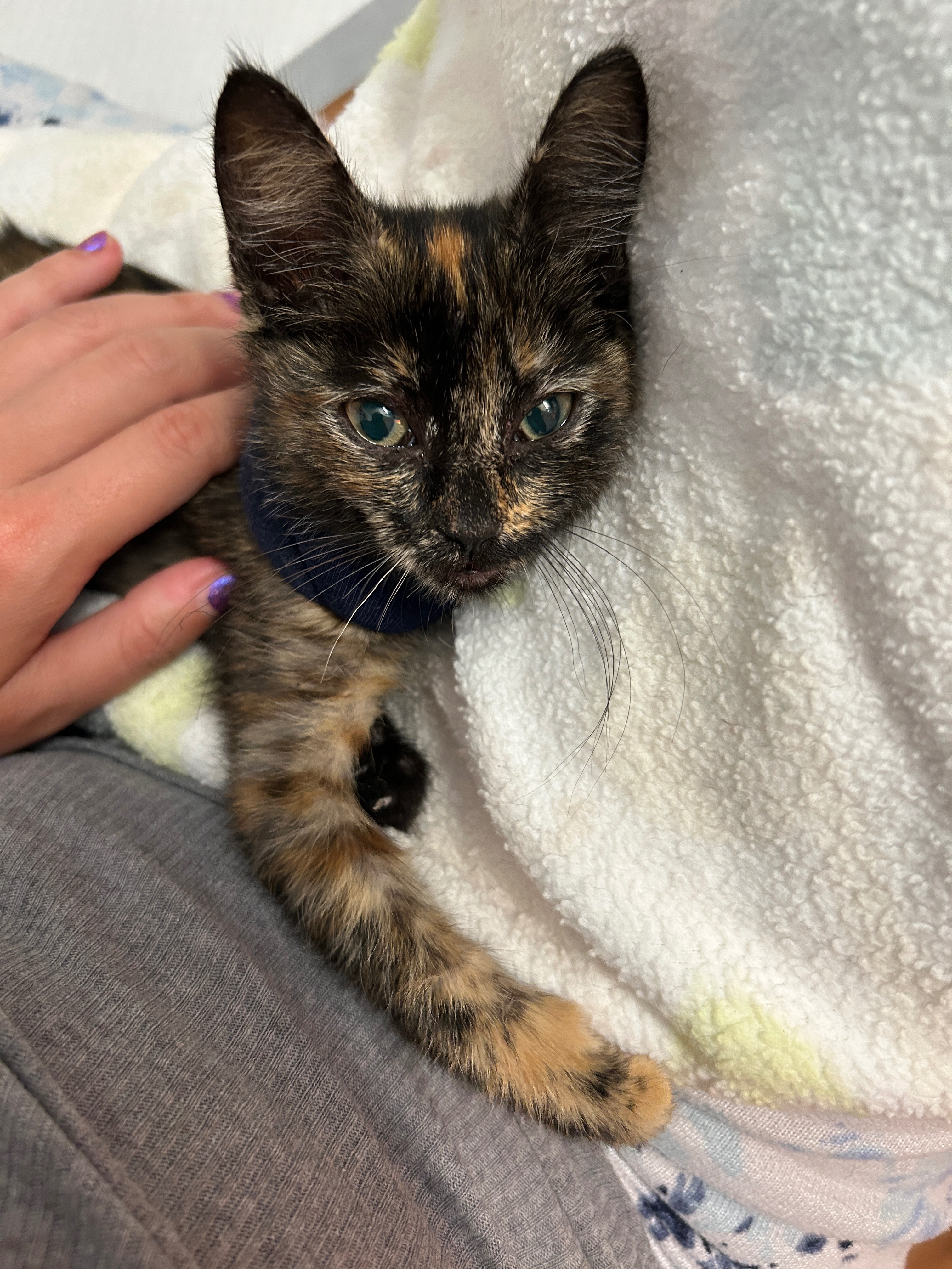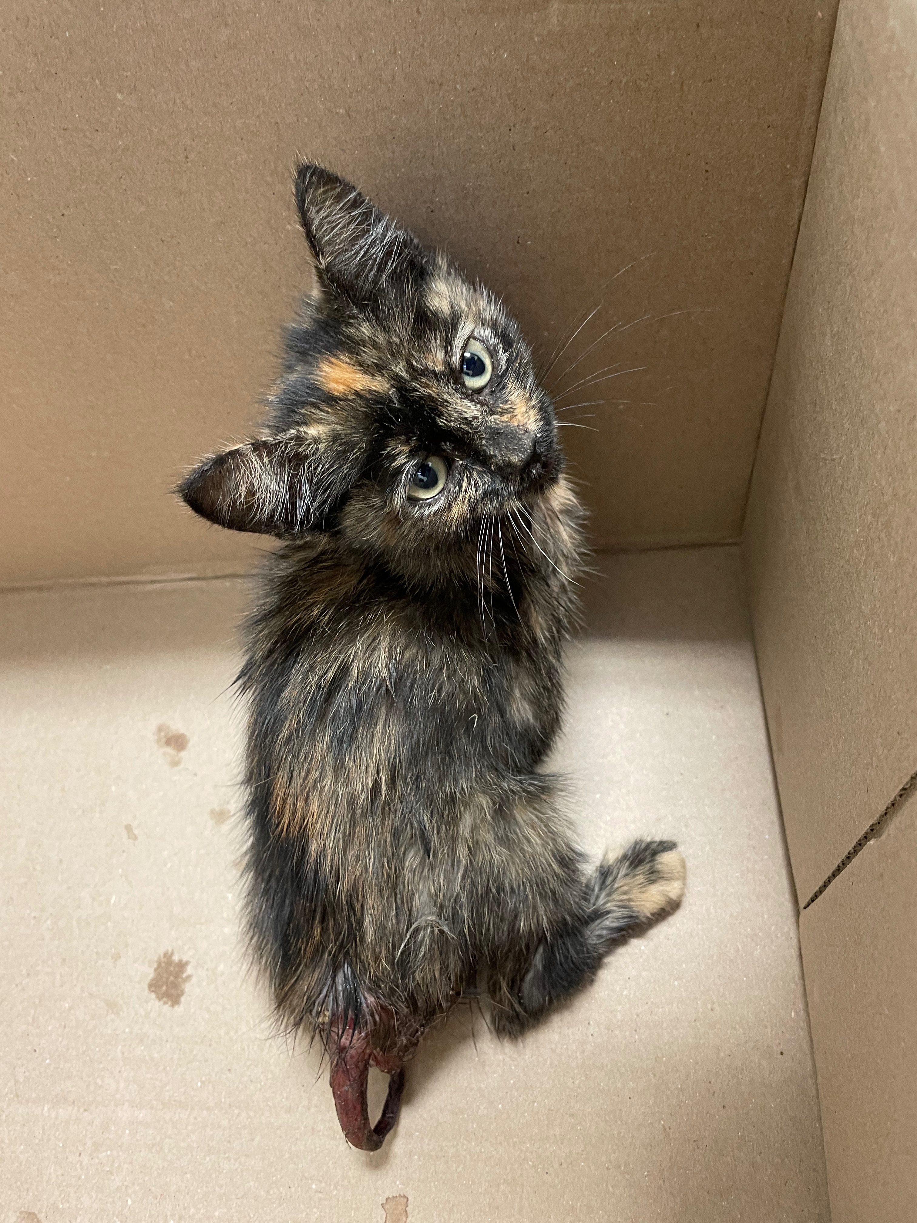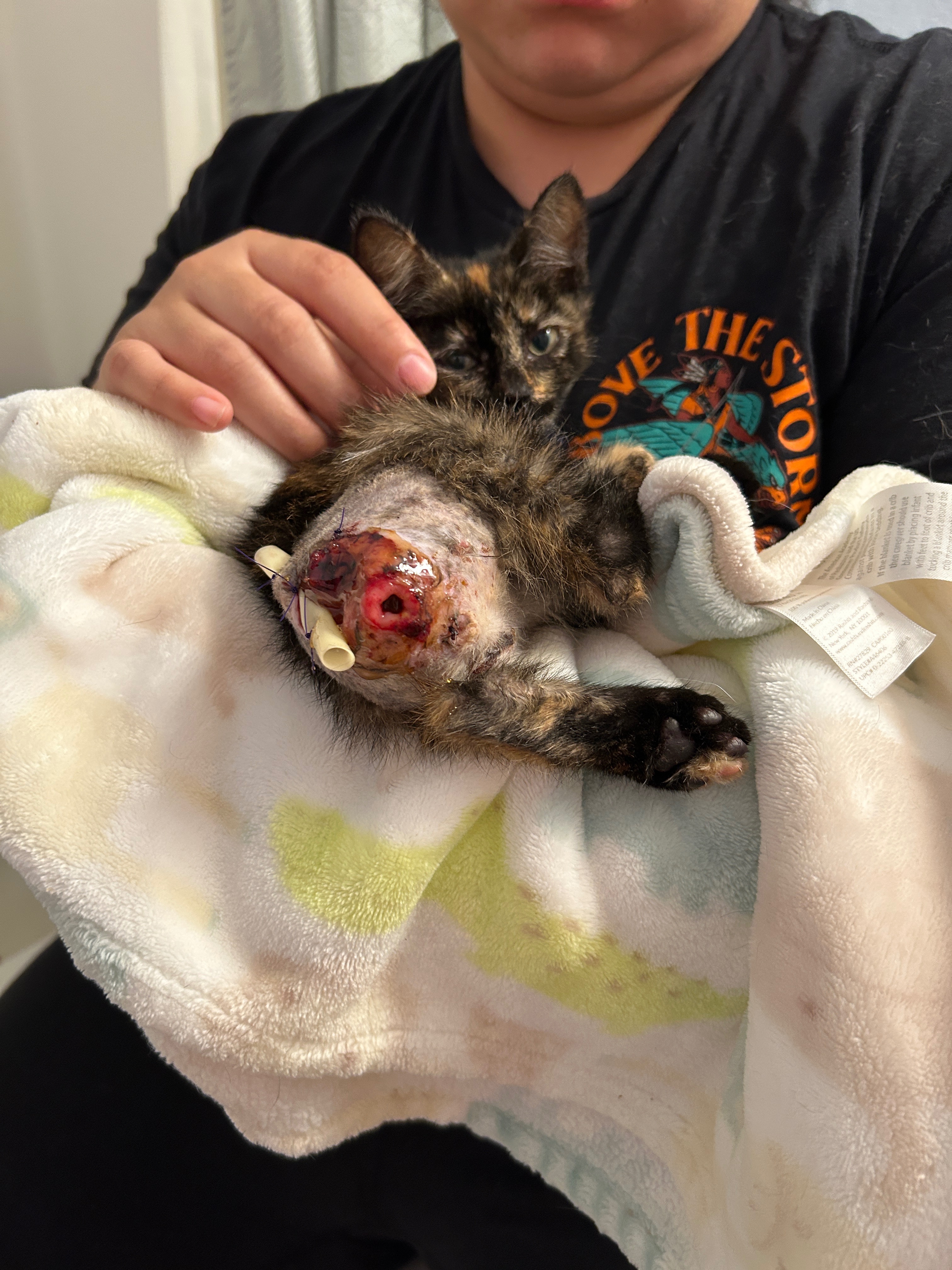 We found this sweet little girl in pretty bad shape at work. I rushed her to the emergency vet and we were able to stabilize her. We are two vet visits in and they have managed to remove all the maggots that had burrowed into her body, remove her necrotic tail, and give her a fighting chance at having a normal life. She’s got a few more vet visits and procedures ahead of her to make a complete recovery and will require special food and medication. With 3 cats and 1 elderly dog of our own, we need help covering expenses to keep this little one alive and well. My partner, Jackie, and I will be fostering her until she makes a full recovery and are asking for some assistance. Considering we were initially told euthanasia was a good option for her to now seeing her eat and play after surgery, we’re hopefully this little one will grow up to be a strong cuddly cat with a story to tell.