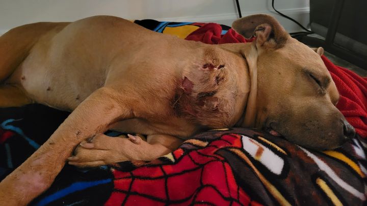 That changed very abruptly on December 13th, 2022. I got a call that she had a little lump on her throat/ chest area and that they couldn't afford a vet. I asked that she be brought to me right away, and a few hours later she was carried to me with a lump on her throat and no knowledge of how it got there. She had lost nearly 15lbs (she is normally 55lbs- so this is a huge amount of weight to have lost), and she was in so much pain that she could not walk, eat or hold her bladder. The very next morning I had her in to see her vet.