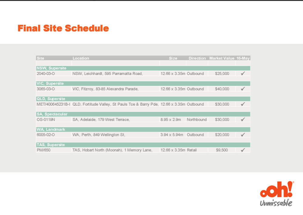 The company we are utilising is oOh Media: http://www.oohmedia.com.au/. The billboard will be up for one month, in very high-traffic areas, with potential for them to be seen by millions of people.