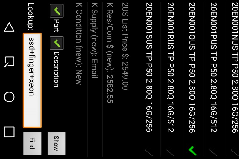 LenovoLook Pro is a free app for Android devices, available from the Google Play Store. Screen capture images are posted there to explain how it works. Try it ! An earlier version (without the Pro) is also free, for older BlackBerry smartphones. I would like to provide an Apple version for iPhones and tablets. The app is a search engine, and needs one or more databases with Lenovo product, price & supply info. The Pro version for Android devices automatically checks for the presence of the US ThinkPads, and automatically downloads & installs it so the search engine is ready to go right away. The latest version downloads another 8 databases. You can search for full or partial partnumbers, and/or text strings, separated by the plus sign. Example - ssd+quad core+l540. If you click on any "hit", it will display the price & supply values. Click on SHOW and it will display the extended description. Multiple other databases are available from a separate web site, even some with Lenovo product descriptions in French (France/Canada) or German (Germany/Austria). All databases and end-user support are free.