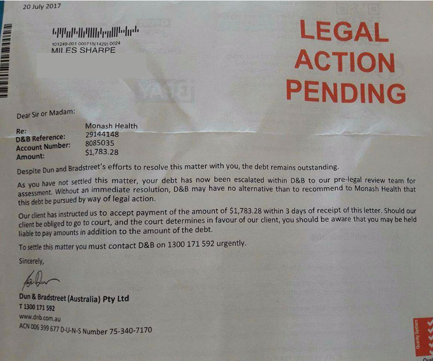 On Day 2 of his hospitalization, my mother and I were informed by the Overseas Billing Department of the Monash Medical Center, that unless the full amount of $12,519.30AUD was received within seven days of the discharge date (Wednesday, 21st, September 2016), the Australian Authorities would be informed that Miles was in default (of medical bills).