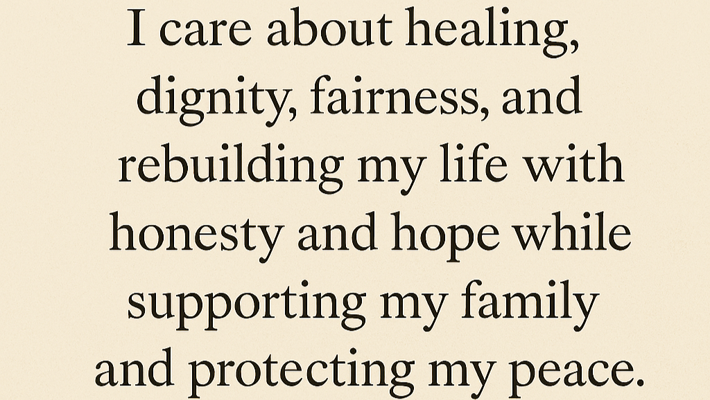I care about healing, dignity, fairness, and rebuilding my life with honesty and hope while supporting my family and protecting my peace.
