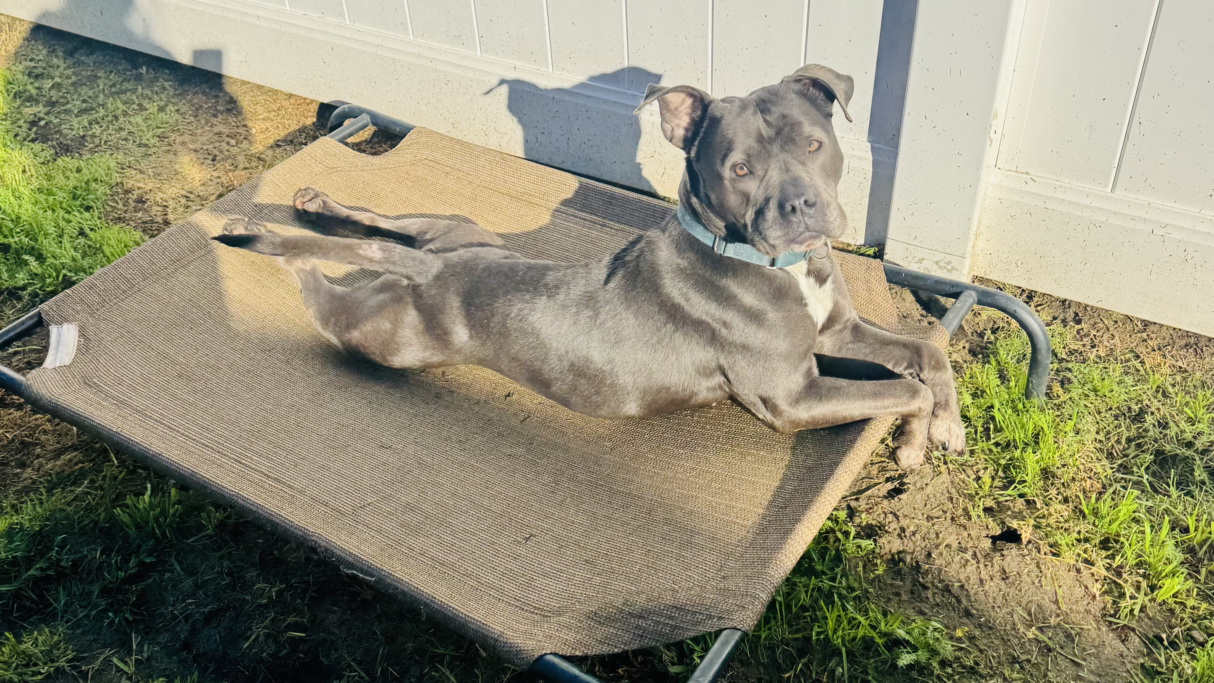 Bucket’s life hasn’t been easy. His previous owner went to prison, leaving him behind to enter the shelter system. When we found him, he had small cuts scattered across his body, and painful bacterial sores on his feet, legs, and elbows — clear signs of a rough and neglected past.