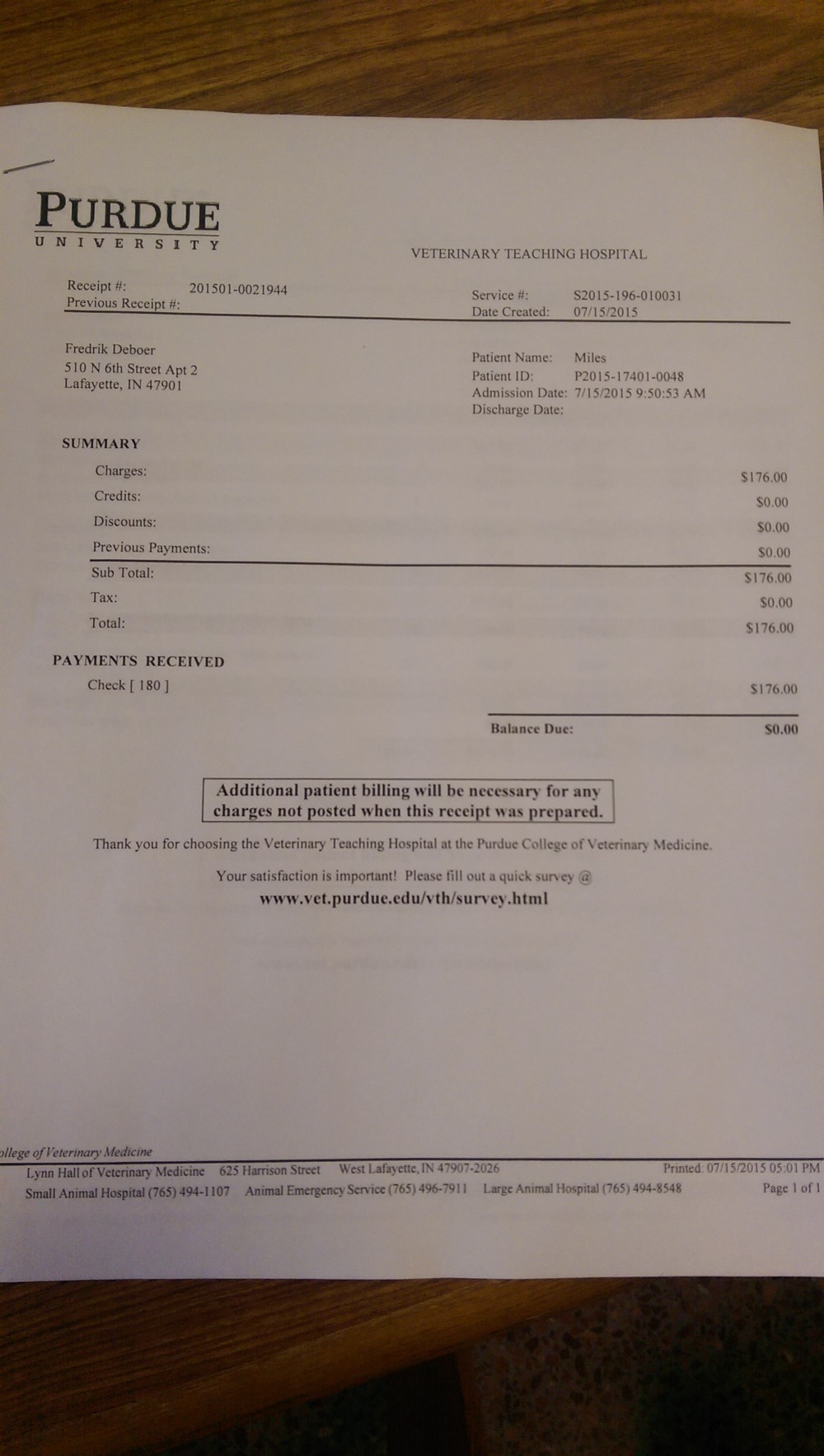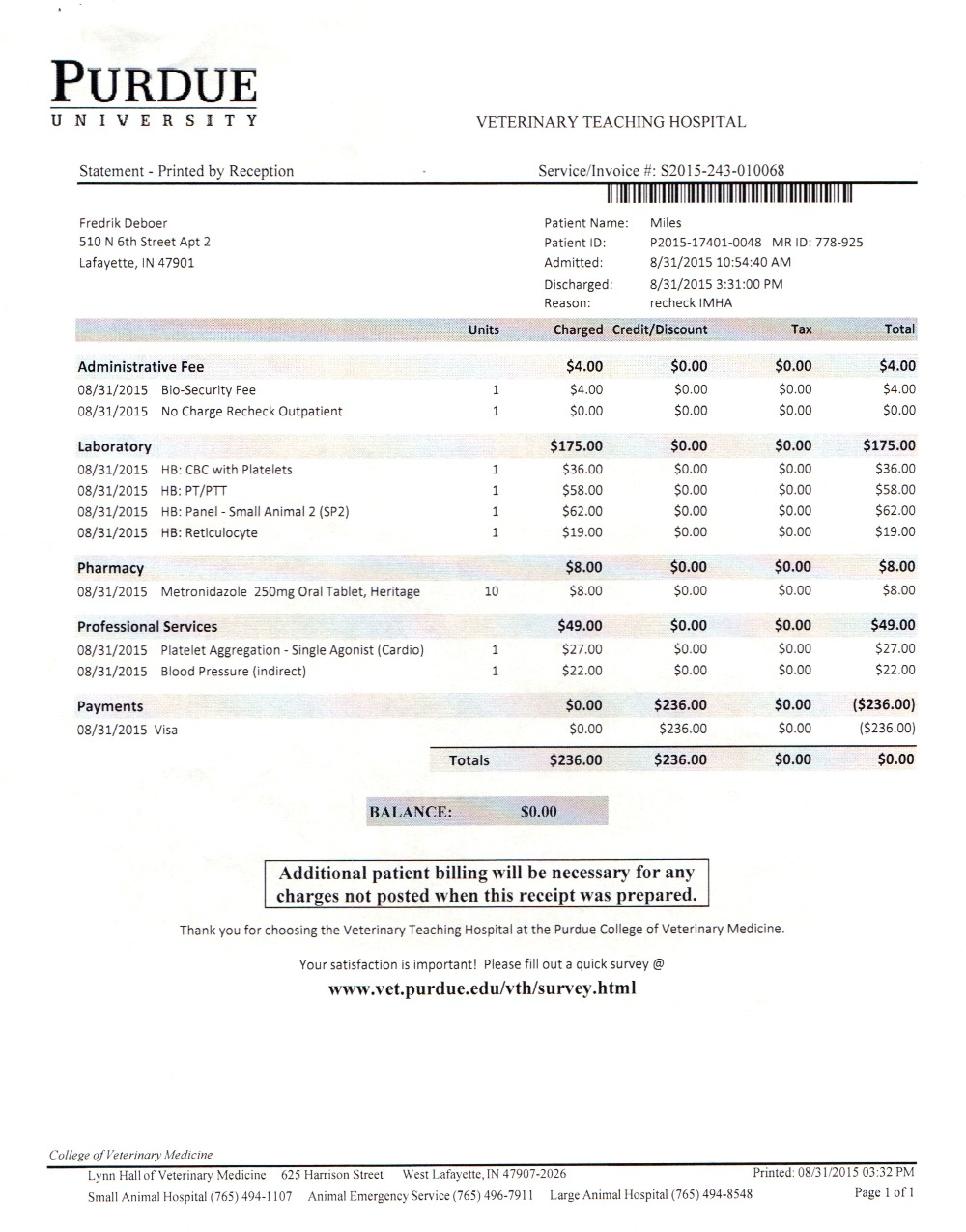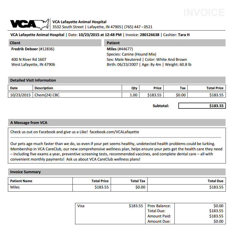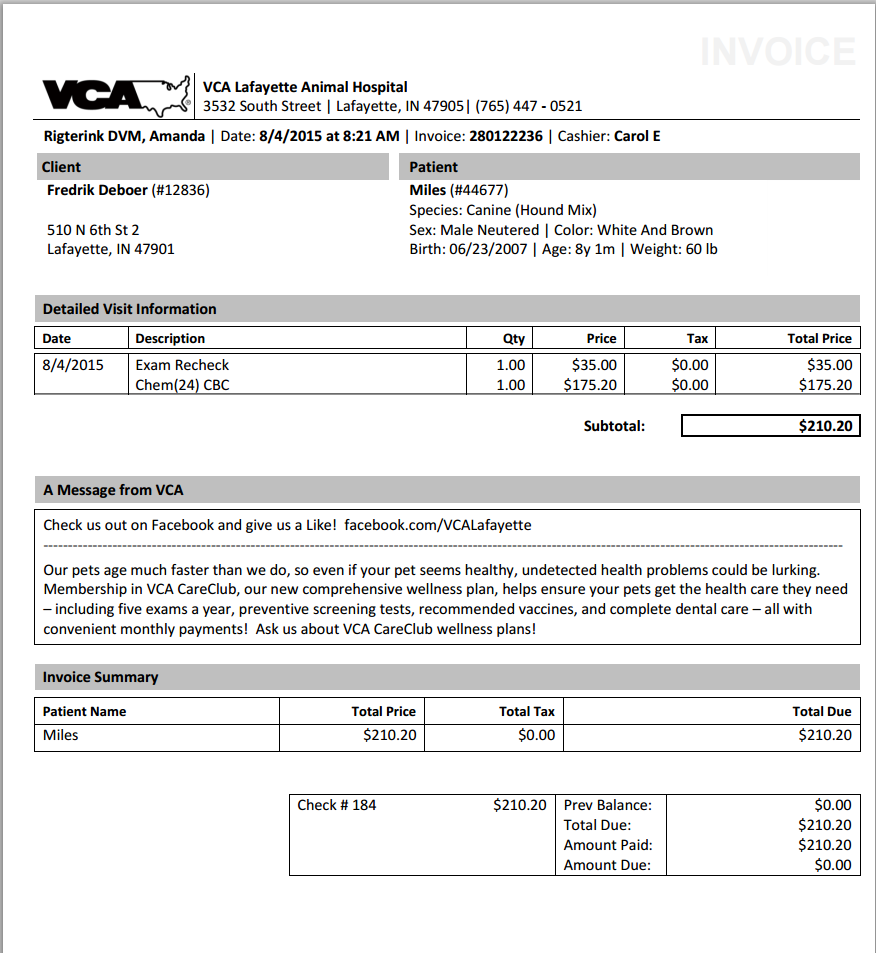 Hey guys, the last time I updated you on Miles's condition, it didn't look good. He was having severe bleeding spells, and I was sure I would have to have him put down. Well, after discontinuing one of his medications, we have not had a nose bleed in more than a week. He's looking pretty good as far as energy and movement goes. Yesterday, I took him to the vet, and I am waiting on the results of his blood work. It's impossible for me to say if it will be good or bad news, but I'm feel hopeful. I'll let you know what they say. Latest bill is attached.