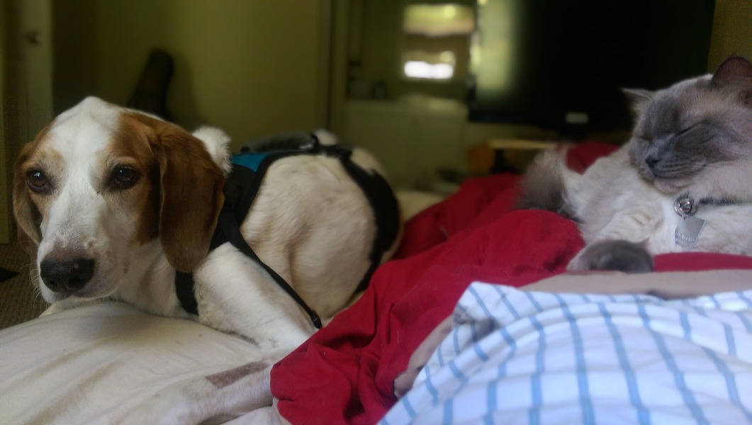 I'm very sorry to tell you that my dog, Miles, has taken very ill this past week, and I'm forced to ask for some help in paying his vet bills. Miles is an 8 year old hound mix, about 70 pounds. Before last weekend, he was in fine health, very energetic. But this past weekend, he stopped eating. That isn't so unusual for a couple days at a stretch, but on Monday he was very lethargic. A trip to the vet brought bad news. Miles has Immune-Mediated Hemolytic Anemia, a type of autoimmune anemia where his immune system is attacking his red blood cells, leaving him tired and lethargic and with labored breathing. It's unclear what's causing this condition. I'm convinced that it was something he ate, as he had metallic material in his colon which has since passed, but the vets aren't sure. His condition is life-threatening and the vets told me there is a good chance he won't make it.