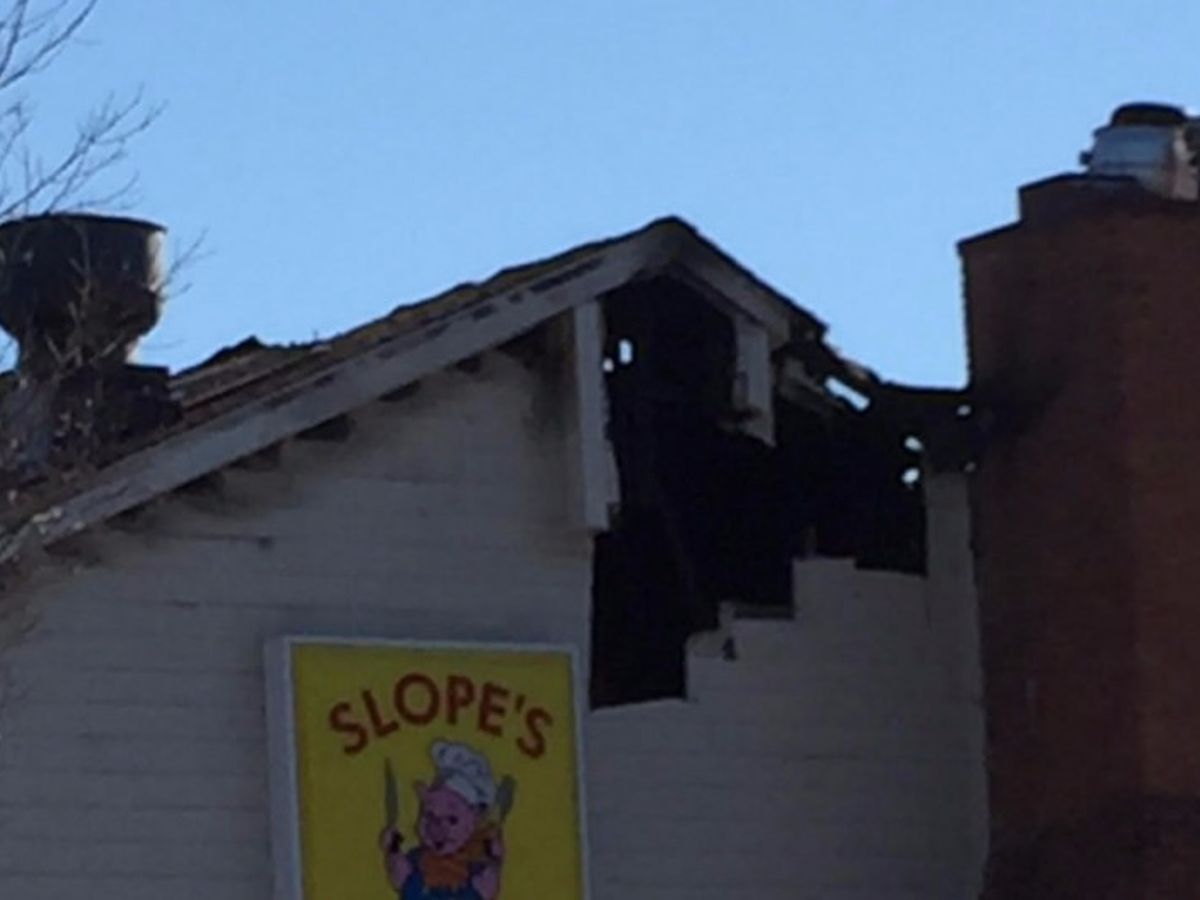 Slope's BBQ, a family-owned pillar-of-the-community business in Sandy Springs, burned this morning. I don't have all the details -- I heard the chimney caught fire and the roof burned...The fire station is literally across the street, so it didn't take long to respond, but there's smoke, fire and water damage from the basement to the roof.